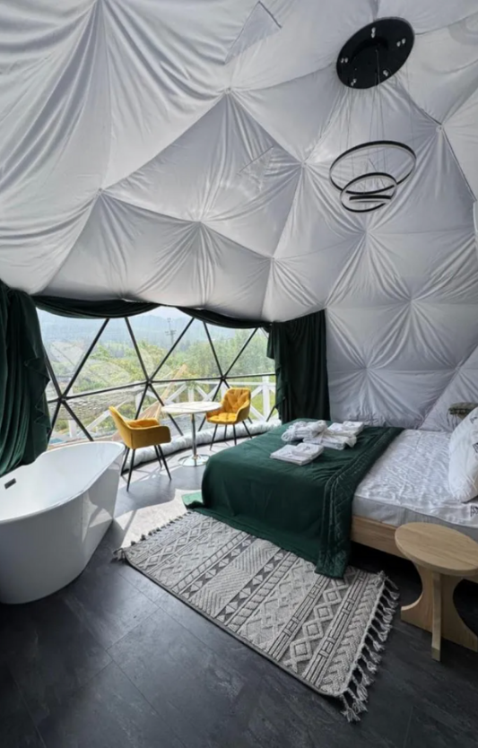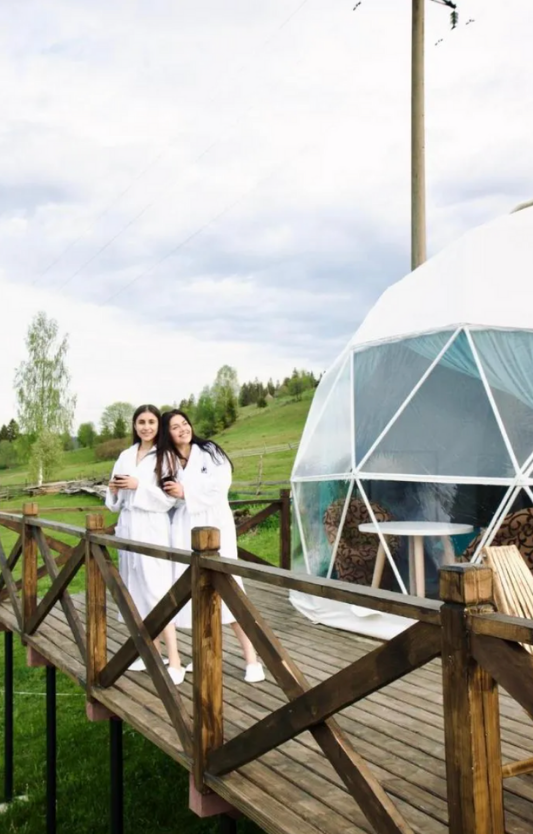 - Комфортні куполи й номери з усім необхідним: міні‑кухня, Wi‑Fi, власна ванна, халати, фен.